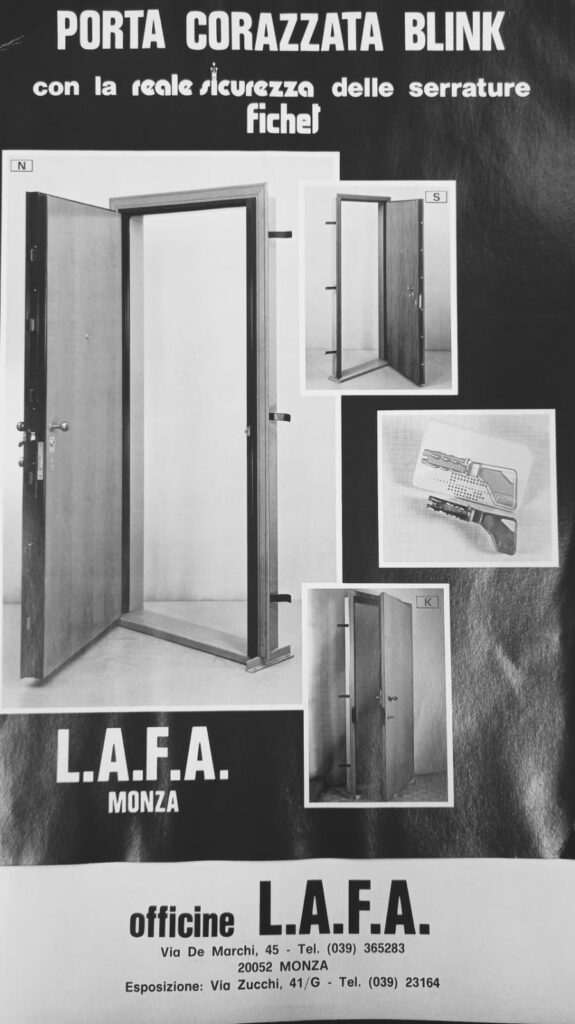 La Lafa costruiva artigianalmente in officina le porte blindate con i componenti Fichet, esponendole in un piccolo negozio in via Zucchi, nel cuore di Monza, con all’interno solo tre porte e servizio di duplicazione chiavi.
